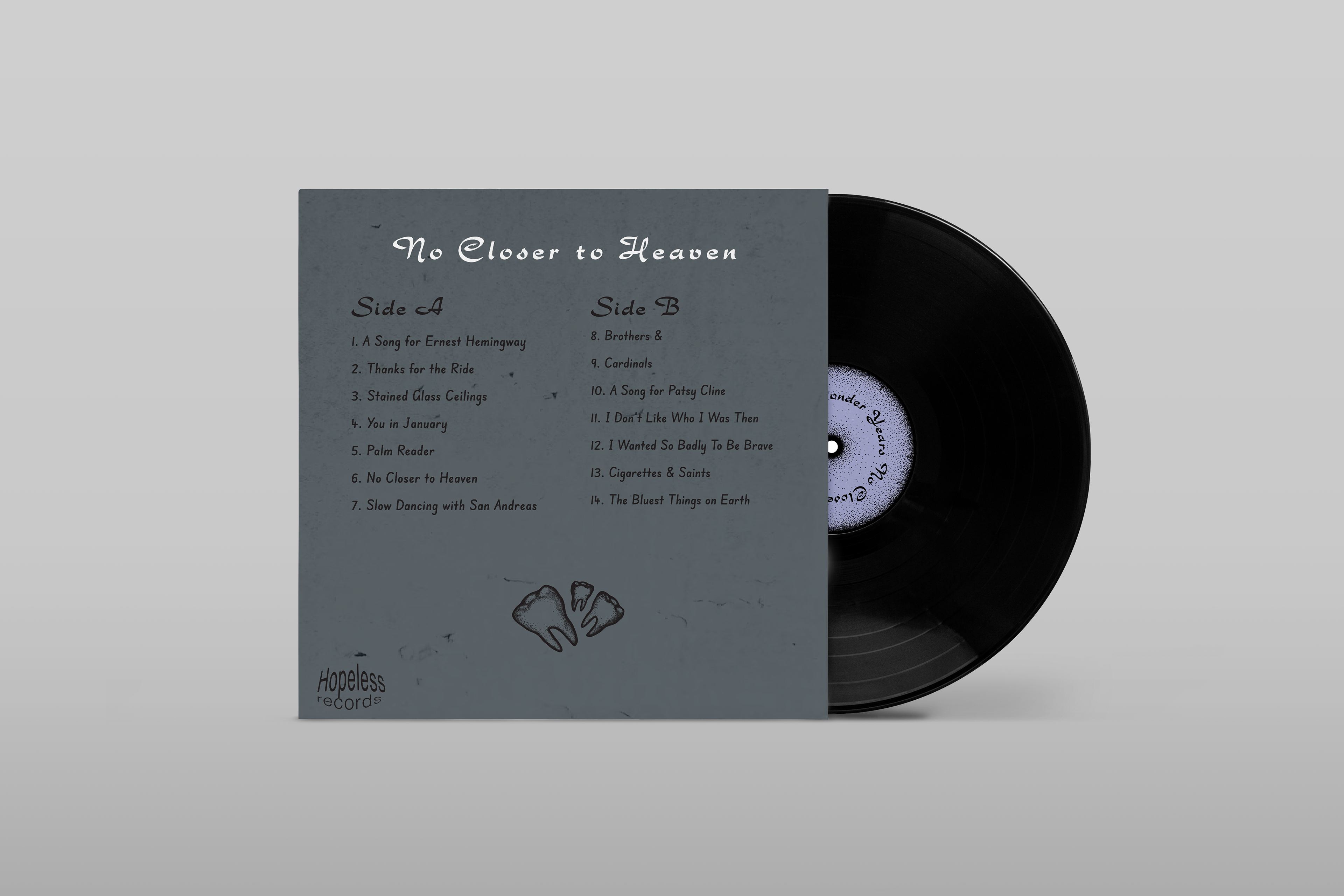 I chose the album No Closer to Heaven by The Wonder Years as the foundation for this project. I listened closely to the music, taking note of recurring themes, imagery, and narratives that emerged throughout the album. By analyzing music I identified key motifs and moods that could be translated into a visual language. This process allowed me to connect the auditory experience with design decisions, informing the composition, color palette, typography, and overall aesthetic of the redesigned album.