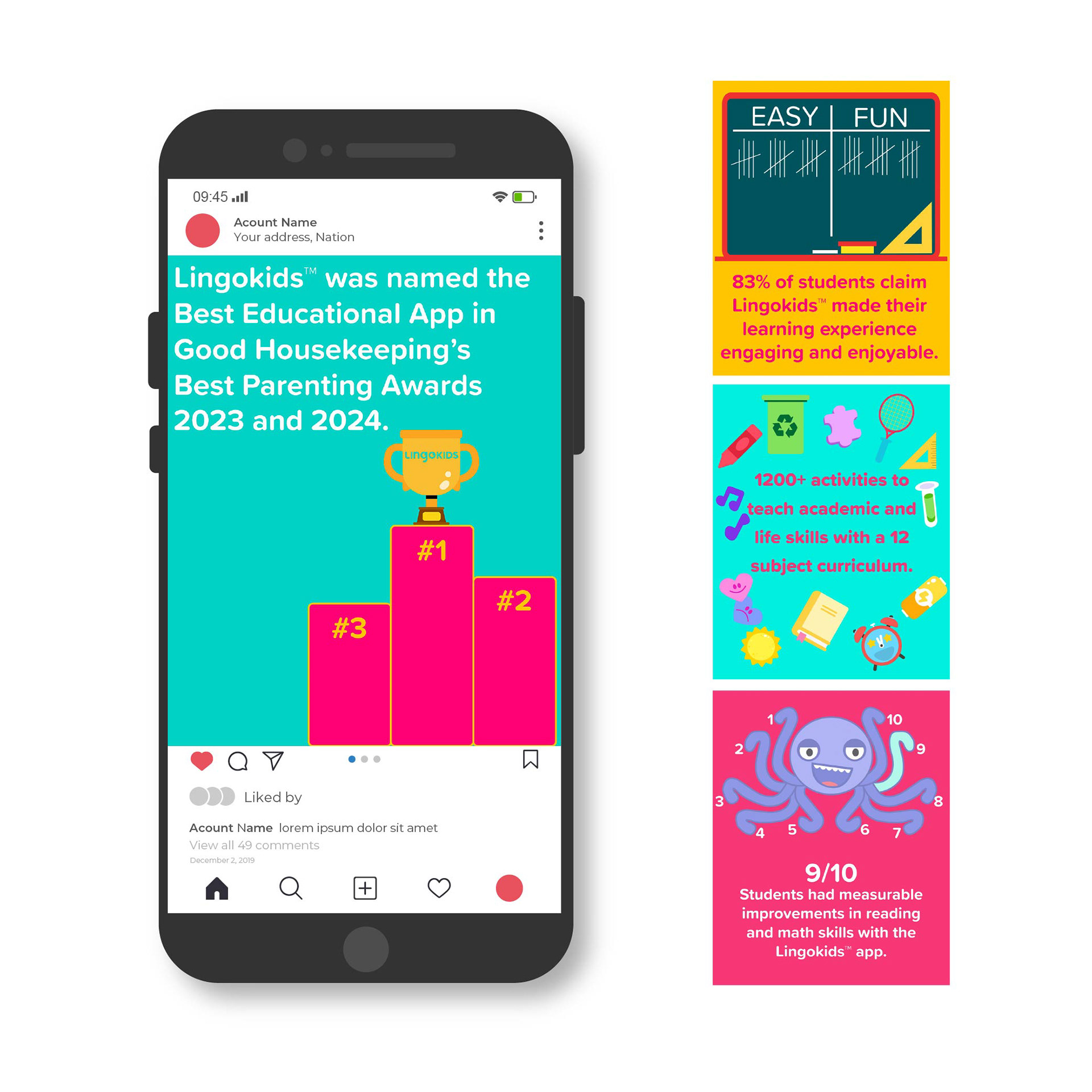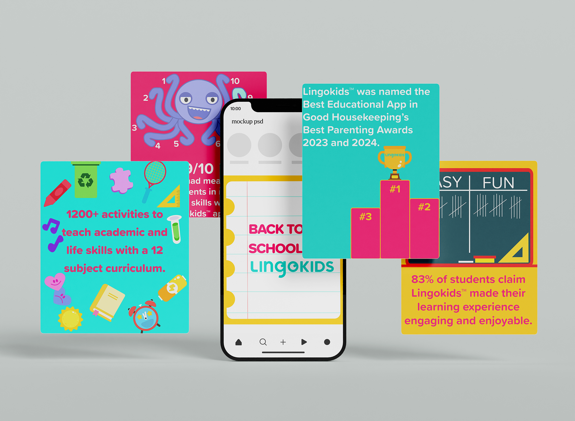 This project is an infographic carousel post for the Lingokids app. The goal was to extend the brand’s existing identity while creating a visually engaging narrative tailored to its audience. The design builds on Lingokids’ playful and educational tone, using cohesive visuals and clear storytelling to connect with parents and young learners.